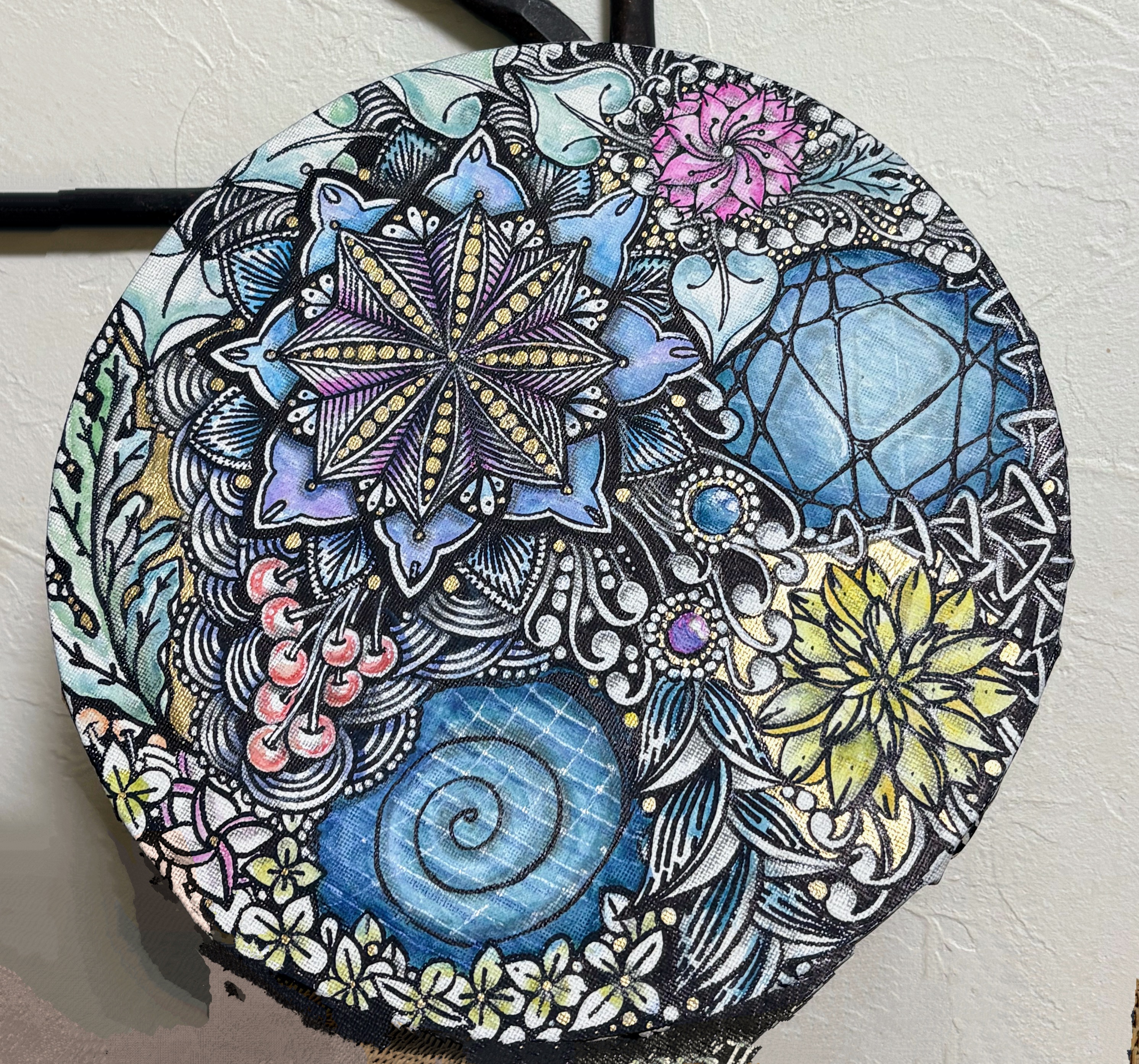 キャンビスに、油性ペンと顔料インクのペン二種類で線を描いて、その上から色鉛筆でやさしく色を重ねて。 「うん、いい感じ!」と自分でも嬉しくなるような仕上がりでした。