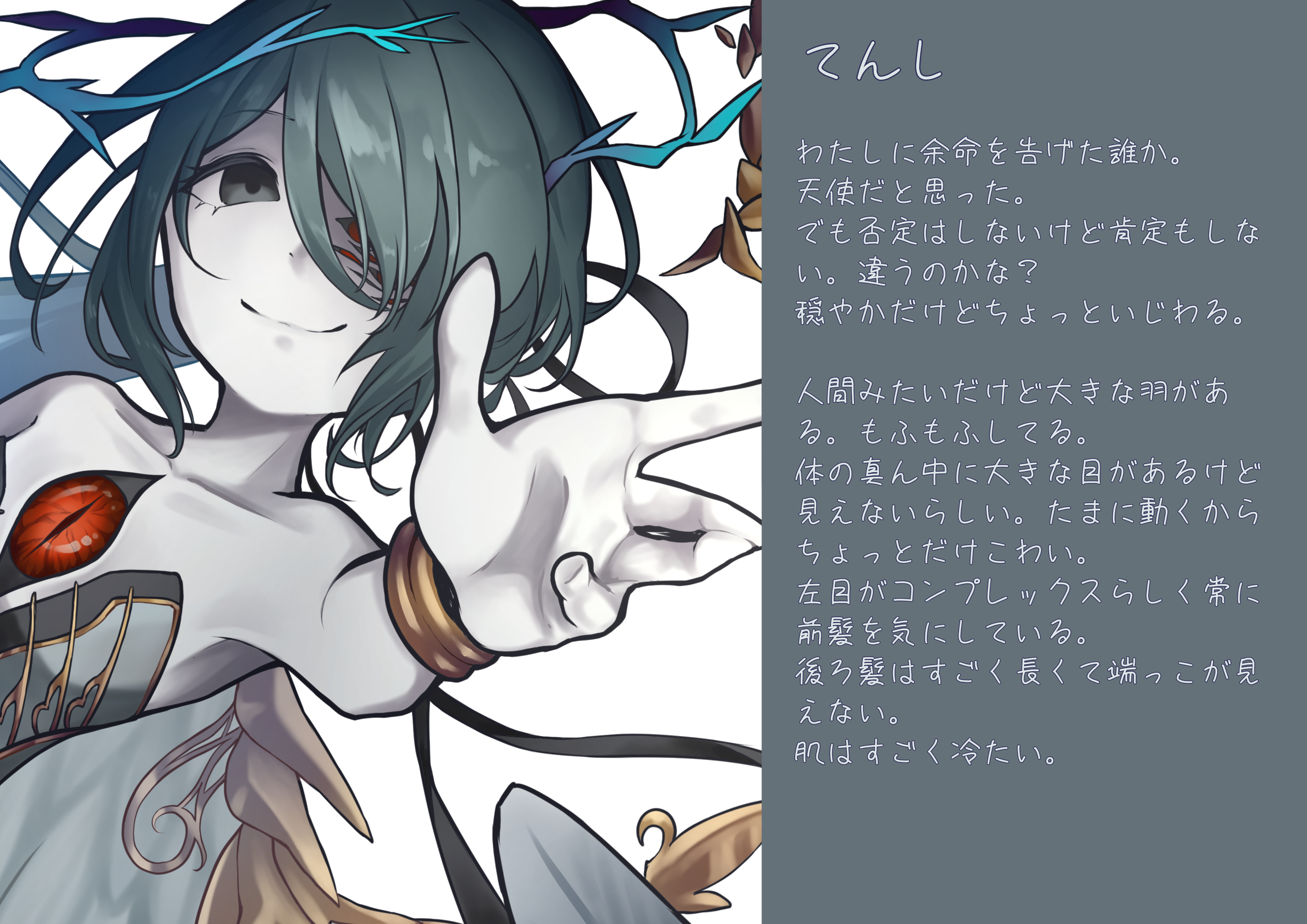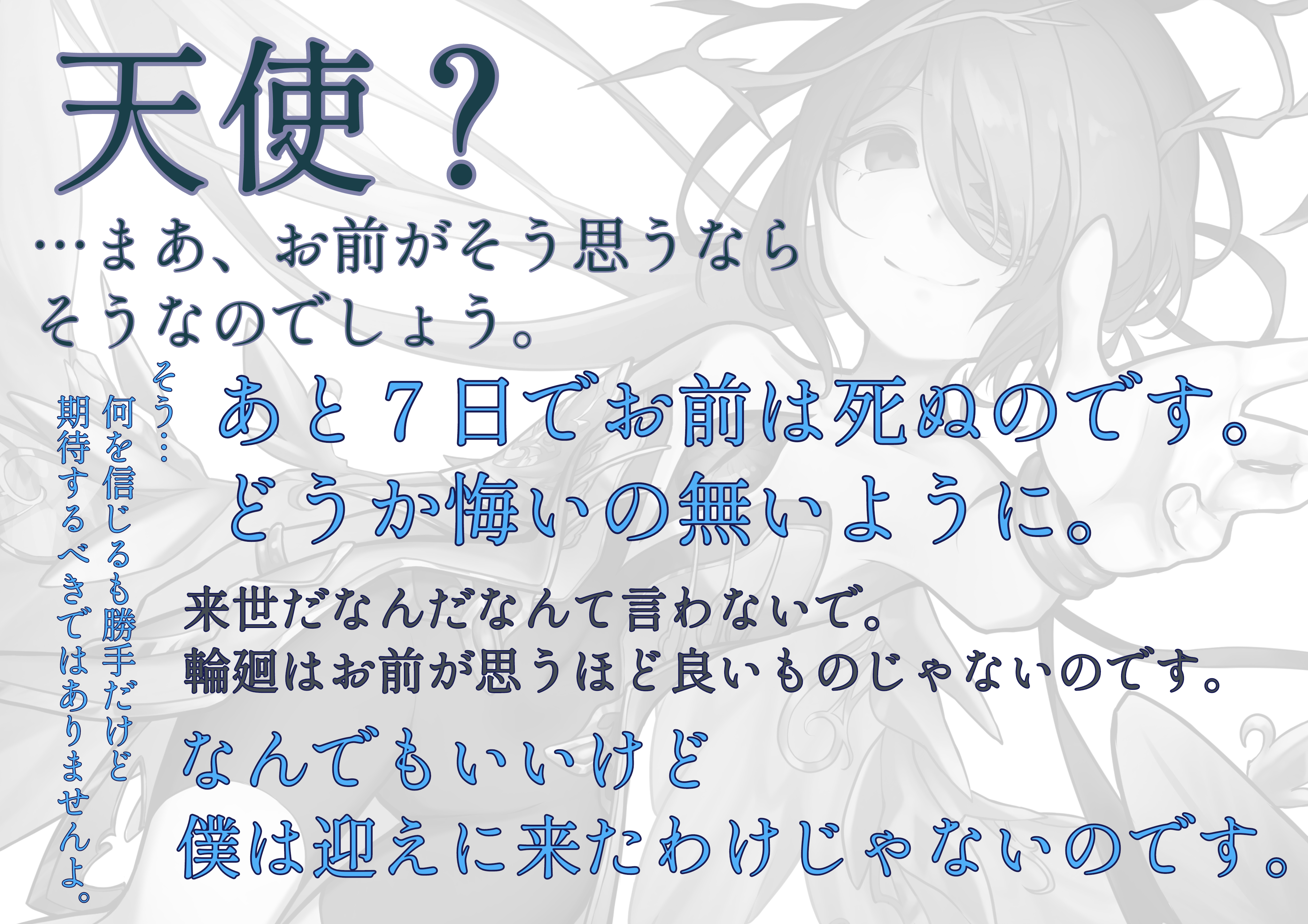 少しだけ話すと、神のいない世界には魂を循環させるために天使という存在がいます。お役人みたいな感じです…てんしは元天使で今は死ぬ前の人間に死を告げて反応を楽しむような(憐れむような)存在です。