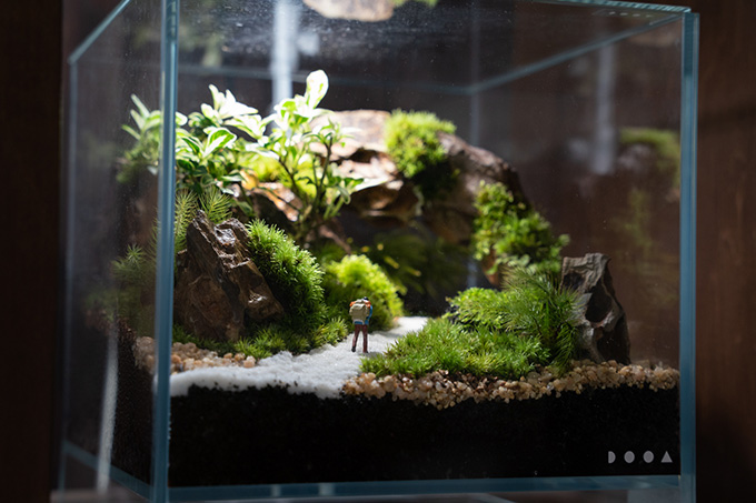 ガラス器の形に合わせて湿度を設計し、苔の種類に合わせて光の角度を調整し、石や流木で小さな地形をつくる。